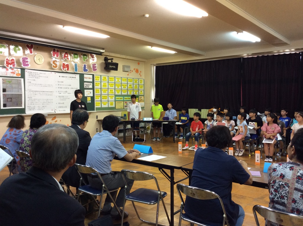 「B小まつり」の代表委員会の児童が司会を務め、会を進行しました。この日は、地域の方々も集まり、お祭りで必要な準備物や連絡事項を説明ました。