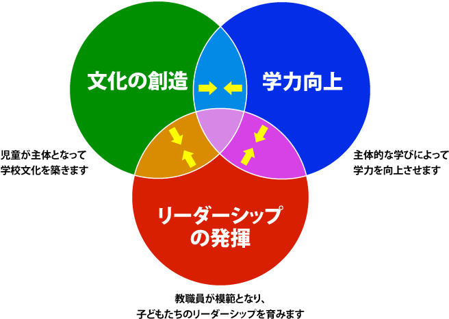 「リーダー・イン・ミー」は、どんな学校においても共通の課題や目標となる「リーダーシップ」「文化の創造」「学力向上」の3点において、その効果を高めることを目的に設計されています。