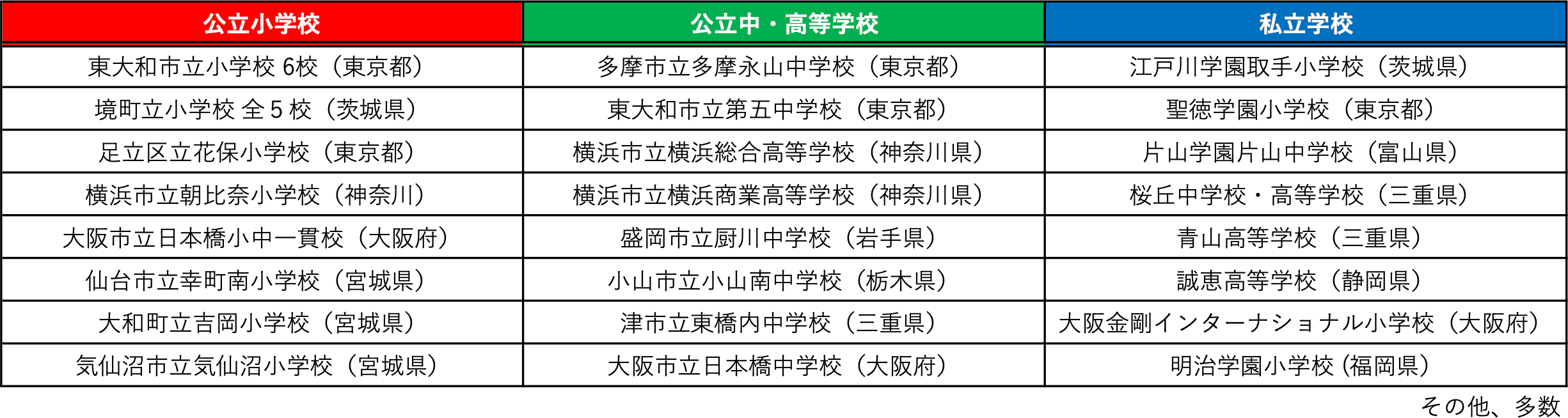 リーダー・イン・ミー導入校、または「エントリーモデル」 「7Hスクール(旧システム)」での取り組みを行った学校は、2014年から現在までで80校以上になります。下記は導入実績のある学校(一部)です。